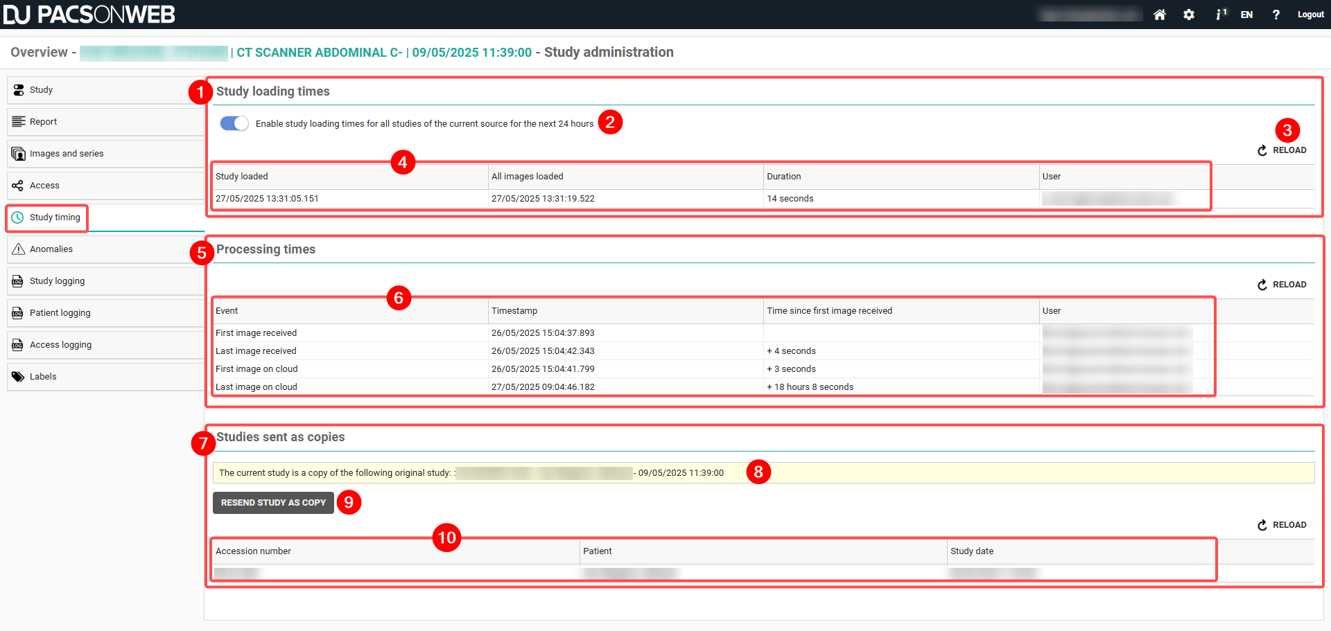 7 | Studies sent as copies | A section of the Study timing tab that displays the studies that have been sent again, including the originating study if it was a study that was sent again. |
